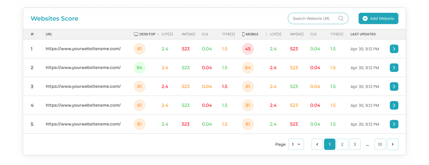 We have a free plan that allows users to easily check up to 3 websites. Our tool automatically looks at the first 10 links of each website for free and gives you a full view of how well they perform. These scores are from Google PageSpeed Insights, so you can easily see your Core Web Vitals daily.